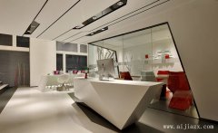 前臺采用PVC扣板平面式的吊頂天花,加上簡單的黑鏡修飾線條邊框,集成的方式保證房間換氣、照明和室溫調控的功能,奠定房間整潔大方的基調。前臺采用簡單創意的幾何造型構造,增加房間的空間層次感,賦予辦公室獨特的個性。