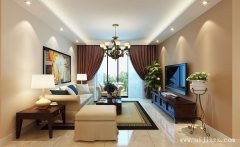 客廳使用簡單的暖色系裝修搭配,漸變的背景墻顏色減去沉重的木質顏色,天花一個簡約挑高吊頂,米白色的乳膠漆刷成,搭配米黃色乳膠漆刷的背景墻,以及大理石地磚,不用太多的照明,也顯出房間的光亮,簡化的美式元素在客廳的家具上面依稀可見,淡淡的美式風情在這樣簡單大方的客廳中十分和諧美妙。
